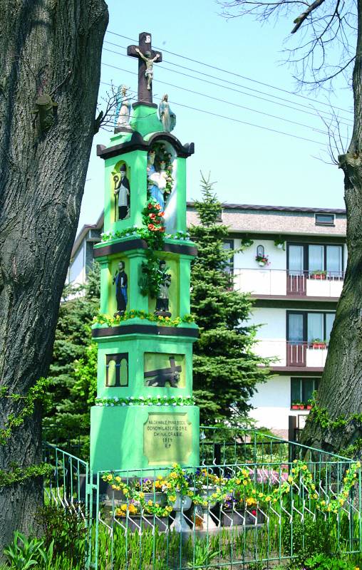 Kapliczka wykonana została pod koniec XIX wieku. Słupowa, kamienna, trzykondygnacyjna, na dwustopniowej podstawie. Na cokole znajduje się nisza z inskrypcją. W ścianie frontowej pierwszej kondygnacji płycina z upadkiem Chrystusa pod krzyżem. Z lewej strony podwójna arkada, z prawej budynek z przedbramiem nakryty czterospadowym dachem. W drugiej kondygnacji od frontu św. Jan Nepomucen, z lewej św. Piotr, z prawej św. Paweł. Narożniki kondygnacji opięte są pilastrami. Na trzeciej kondygnacji od frontu znajduje się Matka Boska z Dzieciątkiem, w lewej niszy św. Stanisław z Piotrowinem, w prawej św. Barbara.