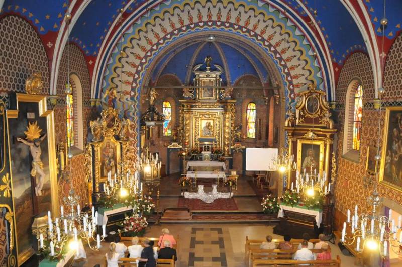 Na tle modernistycznej polichromii z 1912 roku rysują się trzy barokowe ołtarze. Wielki ołtarz, pochodzący z roku 1712, wykonany jest z drewna, złocony i malowany: kręcone kolumny oplecione girlandą roślinną dźwigają szczyt z obrazem Matki Boskiej Anielskiej. Po bokach znajdują się dwie bramki do wejścia za ołtarz, nad nimi widnieją rzeźbione figury świętych apostołów Piotra i Pawła. Główną, środkową część ołtarza zajmuje cudowny obraz Matki Bożej Gajowskiej, pochodzący z roku ok. 1500. Urządzenie kościoła, a zwłaszcza wielki ołtarz wskazują na niezwykłość miejsca, które świadczy o wielkim kulcie okazywanym Najświętszej Maryi Pannie: po bokach wiszą wota, ofiarowane Maryi w podziękowaniu za otrzymane łaski – niestety większość z nich nie zachowała się do naszych czasów. Boczny ołtarz w nawie po lewej stronie, wykonany w 1718 r. przez Jana Komoniczka, poświęcony jest Matce Bożej Różańcowej, której obraz namalował w roku 1873 Walery Eliasz z Krakowa. Po bokach widnieją dwie kręcone kolumny, na nich spoczywają posągi aniołów, w nasadzie znajduje się obraz Zwiastowania, całość wieńczy posąg Michała Archanioła. Ołtarz boczny z prawej strony pod wezwaniem Serca Pana Jezusa jest skromniejszy, pochodzi też z początku XVIII wieku. Jednakże wydaje się być przerobiony i nie posiada tej wartości co poprzedni. Czwarty ołtarz, po lewej stronie nawy, pochodzi z roku 1899. Mieści w ramie wielki drewniany krucyfiks na tle panoramy Jerozolimy. W roku 1996 ołtarzowi przywrócono pierwotną kolorystykę (ciemna zieleń), pięknie harmonizującą z sąsiednim ołtarzem Matki Bożej Różańcowej. Wyzłocono znajdujące się na nim stare tabernakulum z roku 1880, „glorię” nad głową Chrystusa, koronę cierniową i przepaskę na biodrach.
