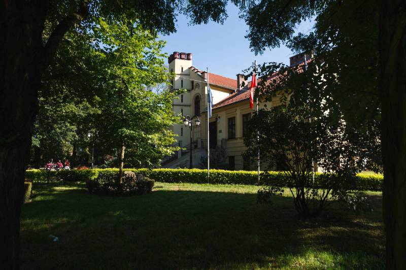 Der kleine Palast „Sokół” liegt im Stadtpark von Skawina. Er entstand an der Stelle einer Wehrburg, die vermutlich noch von König Kazimierz III. Wielki errichtet worden war oder kurz nach dessen Tod. Während der Schwedenkriege wurde sie zerstört, als die Stadt angegriffen wurde. Ende des 19. Jh ging das Gelände in den Besitz des Turnvereins „Sokół” über, der den Bau des Palastes initiierte. Für den Entwurf war Wincenty Koczarkiewicz verantwortlich. Heutzutage befindet sich in dem Gebäude ein Theatersaal sowie ein Café, in dem Vernissagen lokaler Künstler stattfinden. Unweit des Palastes steht das Denkmal von König Kazimierz III. Wielki – dem Gründer von Skawina.