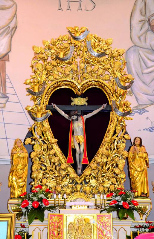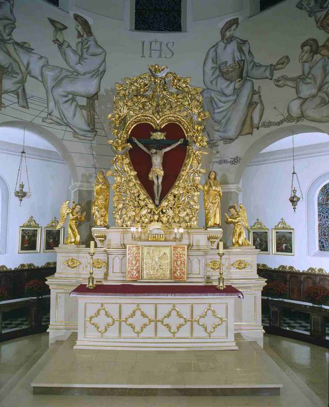 l’autel d’environ 1700 avec un crucifix dans un retable en forme de coeur richement sculpté, formé de brins de vignes, avec des figures de la Vierge et de Saint Jean (gothique tardif) ;