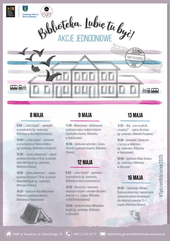 - 9 maja, godz. 18:00 – spotkanie autorskie z Sylwią Chutnik (spotkanie otwarte, Biblioteka Główna).