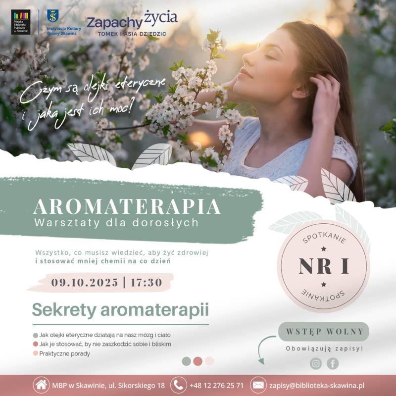 Miejska Biblioteka Publiczna w Skawinie ma przyjemność (liczymy, że będzie to również przyjemność dla Was!) zaprosić na obłędnie pachnące warsztaty aromaterapii dla dorosłych. Warsztaty poprowadzą „Zapachy życia”, czyli Asia i Tomek Dziedzic, którzy z pasją tworzą rodzinną markę, od 5 lat otulając się aromaterapią.