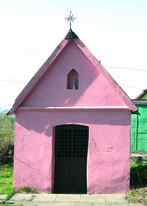 Kapliczka powstała pod koniec XIX wieku. Wzniesiona na rzucie prostokąta, murowana z cegły, otynkowana, nakryta dwuspadowym dachem krytym dachówką. W szczycie wnęka, w niej nowsza figurka Św. Jana Nepomucena. Dach zwieńczony żelaznym kutym krzyżem z promieniami pomiędzy ramionami Odrzwia jednoskrzydłowe, w połowie żelazna krata z krzyżujących się prętów, szyldzik żelazny.