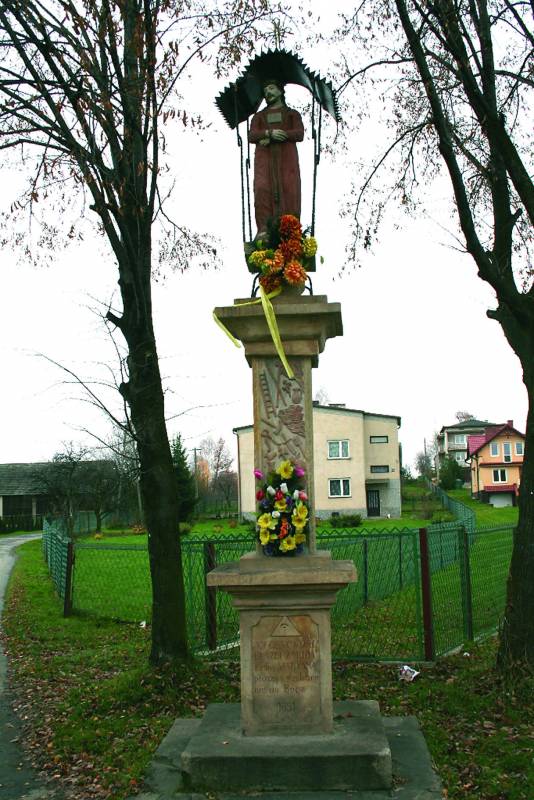 Kapliczka wykonana w 1851 roku, polichromowana, posadowiona na dwóch stopniach. Na ścianie frontowej cokołu oko opatrzności oraz inskrypcja, na ścianach bocznych św. Weronika z chustą na której przedstawiona twarz Chrystusa, oraz Archanioł Michał strącający upadłego anioła. Postument z trzech stron dekorowany płaskorzeźbami. Na ścianie frontowej u dołu płycina z przedstawieniem Ogrójca, powyżej narzędzia Męki Pańskiej. Na ścianach bocznych Matka Boska Bolesna i Chrystus Zmartwychwstały. Kapliczkę wieńczy figura Chrystusa w postawie stojącej, ubranego w szatę przewiązaną sznurem, ze związanymi rękami i tabliczką na szyi. Na głowie korona cierniowa. Figura nakryta daszkiem wspartym na czterech prętach