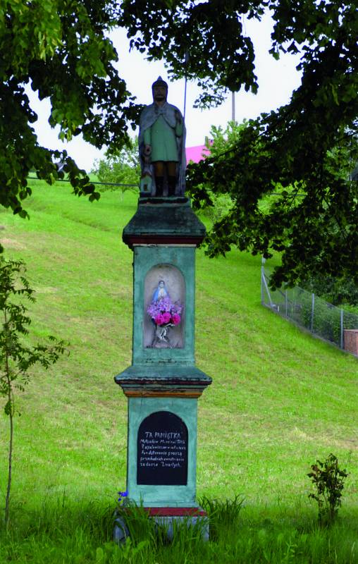 Wykonana z piaskowca kapliczka ufundowana została przez Marcina i Teklę Zapałowiczów w 1884 roku.. Dwukondygnacyjny postument spoczywa na pojedynczym stopniu. Część cokołowa zwieńczona ćwierćwałkiem i simą. Dolna kondygnacja z półkoliście zamkniętą płyciną z inskrypcją oraz bocznymi przedstawieniami świętych. W lewej ścianie św. Tekla w czerwonej sukni, trzymająca palmę w prawej ręce. U jej stóp lew, po lewej stronie płonący stos. W ścianie prawej św. Marcin na koniu, z żebrakiem trzymającym połę płaszcza. Kondygnacja zamknięta gzymsem z podkroju, ćwierćwałka, szerokiej simy i listwy.